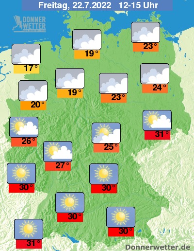 Heute Nachmittag ist es im Norden meist dicht bewölkt. Im Süden ist es hingegen verbreitet sonnig, während es im übrigen Bundesgebiet teils stark, teils aufgelockert bewölkt ist. Es bleibt überall trocken bei 17 Grad an der Nordsee und etwa 31 Grad in der Lausitz.