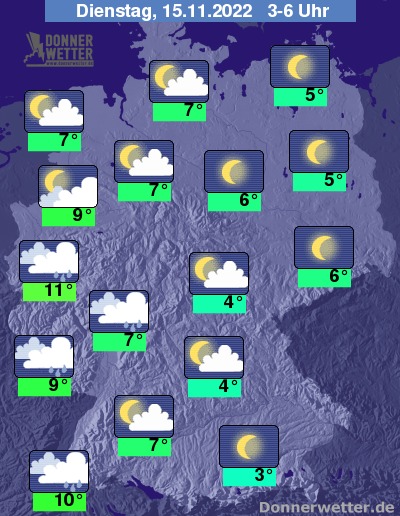 In der Nacht zum Dienstag bringen dichte Wolken vom Oberrhein bis zum Rheinland gebietsweise Regen. Vom Niederrhein bis ins Emsland ziehen auch mehr Wolken auf, wobei es hier weitgehend trocken bleibt. Im übrigen Land zeigt sich der Himmel verbreitet nur locker bewölkt oder sternenklar, dazu bleibt es trocken. Die Temperatur sinkt auf 11 Grad in der Kölner Bucht und bis etwa 3 Grad in Berchtesgaden.