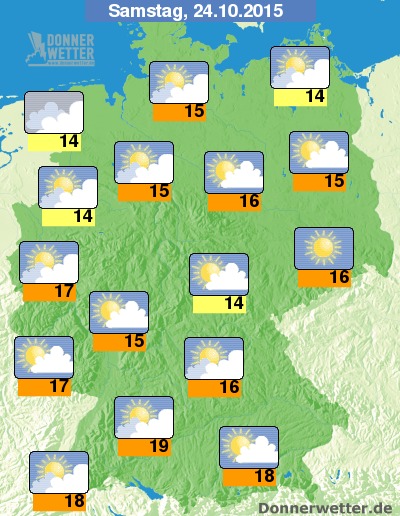 Am Samstag ist es vor allem über der Osthälfte Deutschlands noch häufig heiter bis sonnig. Weiter nach Westen hin startet der Tag meist mit einigen, in den westlichsten Landesteilen auch schon mit dichteren Wolken, dabei nimmt im Tagesverlauf die Bewölkung von Westen her weiter zu und in der zweiten Tageshälfte ziehen auch im Osten einige, meist noch lockere Wolken auf. Gegen Abend ist im Nordseeumfeld etwas Regen möglich, sonst bleibt es jedoch weitgehend trocken. Die Temperatur  steigt auf 14 Grad im Emsland und bis 19 Grad in Stuttgart.