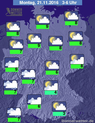 In der Nacht zum Montag ziehen über den Südwesten und den äußeren Westen dichte Wolken mit Regen. Über der Nordhälfte bleibt es meist nur locker bewölkt, sonst ist es aufgelockert oder stark bewölkt und dazu trocken. Die Temperatur sinkt auf 9 Grad im Rheinland und bis 3 Grad in Rosenheim. Der Wind weht im Norden weiterhin teils stark, an der Nordsee noch verbreitet stürmisch.