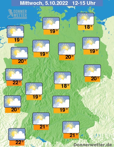 Heute Nachmittag ist es teils sonnig, teils ist es aber auch trüb oder stark bewölkt, dabei bleibt es trocken. Die Temperatur liegt bei 18 Grad in Vorpommern und bei 22 Grad am Rhein. An der Nordsee weht ein oft stürmischer Wind.