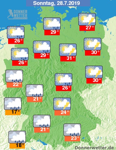Am Sonntag ist es oft stark, hier und da aufgelockert bewölkt, im Norden und Osten sind einzelne Schauer und Gewitter möglich. Im übrigen Bundesgebiet bilden sich hingegen wiederholt Schauer und örtliche Gewitter. Die Temperatur steigt auf teils nur 17 Grad im Saargau und bis 31 Grad in Magdeburg.