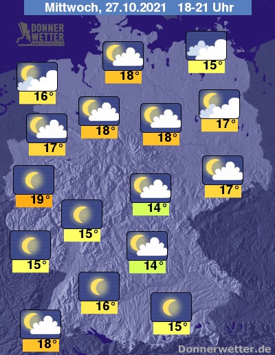 Heute Abend lockert und klart der Himmel über der Südwesthälfte Deutschlands verbreitet auf. Im Norden und Osten ist es hingegen noch oft stark bewölkt, jedoch zeigen sich auch hier mehr und mehr Auflockerungen. Es bleibt trocken bei Werten von 14 Grad im Grabfeld und bis zu 19 Grad in der Kölner Bucht.