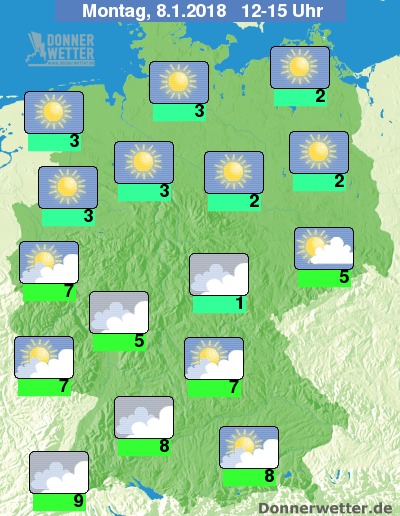 Heute Nachmittag strahlt über dem Norden Deutschlands verbreitet die Sonne von einem wolkenlosen Himmel. Die Südhälfte der Republik bleibt indes oft stark, sonst gebietsweise aufgelockert bewölkt. Es bleibt landesweit trocken bei Werten zwischen 2 Grad an der Müritz und bis 9 Grad im Breisgau.