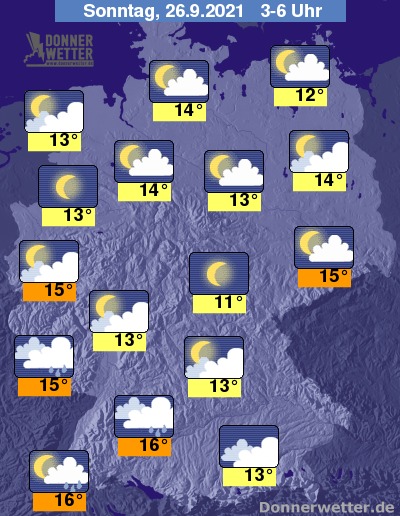 In der Nacht zum Sonntag ziehen im Südwesten Deutschlands dichte Wolken auf und es bilden sich hier gebietsweise Schauer. Auch im Süden und Westen werden die Wolken zunehmend dichter, hier bleibt es aber überwiegend trocken. Weiter nach Nordosten hin ist der Himmel oft locker bewölkt oder sternenklar, zum Teil hält sich jedoch auch stärkere Bewölkung, dazu bleibt es trocken. Die Temperatur sinkt auf 16 Grad in Stuttgart und bis 11 Grad in Jena.