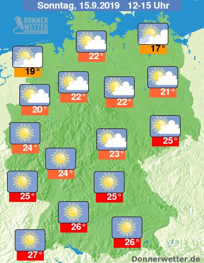 Heute Nachmittag ist es über dem Norden, speziell in den küstennahen Regionen oft stark, teils aufgelockert bewölkt, dabei ist nur selten etwas Regen möglich. Im übrigen Bundesgebiet ist es verbreitet heiter bis sonnig, dabei bleibt es trocken. Die Temperatur liegt bei 17 Grad an der Müritz und bis 27 Grad im Oberrheingraben.