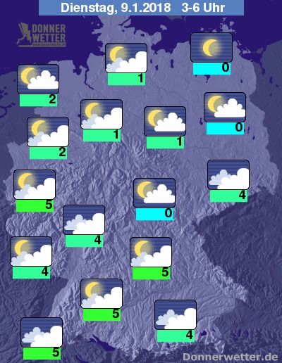 In der folgenden Nacht ist der Himmel über Norddeutschland meist leicht bis aufgelockert bewölkt, im Nordosten ist es weitgehend sternenklar, sonst zieht oft wechselnde, teils starke Bewölkung durch, dabei bleibt es trocken. Die Temperatur sinkt auf 5 Grad in Stuttgart und bis 0 Grad in Neubrandenburg.