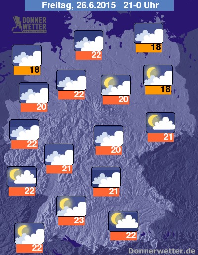 In der Nacht zum Samstag ziehen von Westen dichte Wolken durch und nachfolgend entwickeln sich zunächst im Westen, gegen Morgen auch im Südwesten, Nordwesten bis in die Mitte des Landes zum Teil kräftige Schauer und Gewitter. Im Norden, Osten und im äußeren Süden bleibt es bei wechselnder bis starker Bewölkung weitgehend trocken. Die Temperatur sinkt auf 17 Grad in Möchengladbach und bis 13 Grad im Grabfeld.
