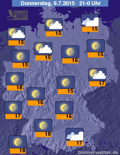 Heute Abend halten sich im Küstenumfeld von Nord- und Ostsee, sowie am Alpenrand noch oft dichte Wolken mit jedoch nur selten etwas Regen. Im großen Rest des Landes ist es hingegen verbreitet sternenklar, hier und da auch locker bewölkt und es bleibt trocken. Die Abendtemperatur liegt bei 18 Grad im Oberrheingraben und um 15 Grad in der Norddeutschen Tiefebene.