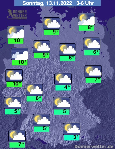 In der folgenden Nacht zieht häufig nur lockere Bewölkung übers Land hinweg, teils ist es sternenklar. Vor allem vom Niederrhein bis zur Nordsee und im Ostseeumfeld halten sich auch gebietsweise dichte Wolken. Es bleibt trocken bei Tiefstwerten von 10 Grad am Niederrhein und etwa 4 Grad im Vogtland.