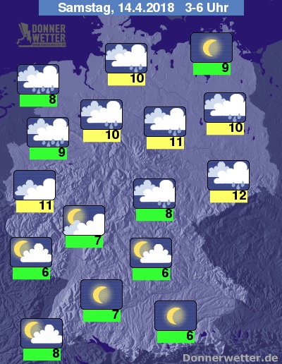 In der folgenden Nacht klart der Himmel über dem Süden verbreitet auf, auch im Nordosten klart es häufig auf und hier bleibt es auch trocken. Über der übrigen Nordhälfte ist es hingegen verbreitet stark bewölkt und es fällt auch zeitweise Regen. Die Temperatur sinkt auf 12 Grad in Dresden und bis 6 Grad im Münchner Umland.