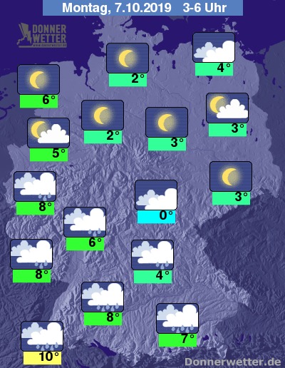 In der Nacht zum Montag fällt über der Südwesthälfte Deutschlands zunächst weiterhin zeitweise Regen, der im Laufe der Nacht immer weiter abklingt, am Morgen kann dann lediglich im Süden noch gebietsweise Regen fallen. Im Norden und Osten zeigt sich der Nachthimmel meist sternenklar oder locker bewölkt. An der Ostsee zieht es sich auch oft zu, dazu bleibt es trocken. Die Temperatur sinkt auf 10 Grad im Oberrheingraben und bis 0 Grad im Grabfeld.