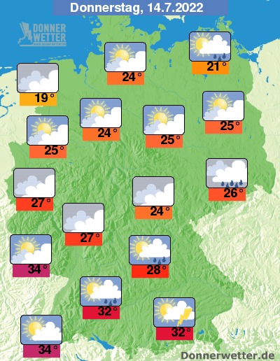 Heute zeigen sich teils heitere Abschnitte, oft ziehen jedoch mehr und teils auch dichte Wolken durch. Es bilden sich vor allem im Norden, jedoch auch im Süden und über Sachsen lokale Schauer, selten auch Gewitter, sonst bleibt es weitgehend trocken. Die Temperatur erreicht 19 Grad in Wilhelmshaven und bis 34 Grad in Saarbrücken.