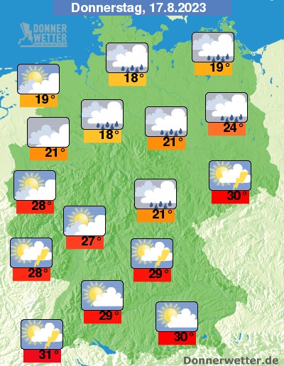 Heute halten sich vor allem im Norden und Nordosten oft dichte Wolken und es bilden sich gebietsweise Schauer. Im übrigen Land ist es teils heiter, teils stark bewölkt und es besteht ein leichtes bis mäßiges Schauer- und Gewitterrisiko. Die Temperatur erreicht teils nur 18 Grad in der Norddeutschen Tiefebene und bis 31 Grad im Breisgau.