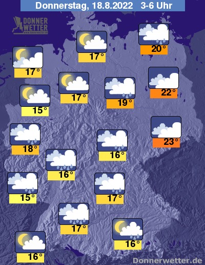 In der Nacht zum Donnerstag ziehen verbreitet dichte Wolken durch und es können sich wiederholt Schauer und mögliche Gewitter bilden. Im Nordwesten ist es jedoch oft nur locker bewölkt und hier bleibt es auch weitgehend trocken. Die Temperatur sinkt auf tropische 23 Grad in Dresden und bis 15 Grad in Münster.