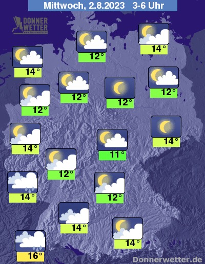 In der folgenden Nacht zeigt sich der Himmel zunächst verbreitet nur locker bewölkt oder sternenklar, lediglich im Alpenvorland können dichtere Wolken noch örtlich Schauer bringen. In der zweiten Nachthälfte zieht es sich von Südwesten dann wieder zu und gegen Morgen setzt zunächst im Südwesten und nachfolgend über der Südwesthälfte Regen ein. Weiter nach Nordosten bleibt es weitgehend trocken. Die Temperatur sinkt auf 16 Grad in Freiburg und bis 11 Grad in Jena.