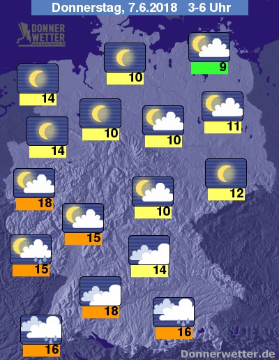 In der kommenden Nacht ist es im Süden meist stark bewölkt, dazu bilden sich gebietsweise Schauer und mögliche Gewitter. Über der Nordhälfte des Landes bleibt es dagegen meist sternenklar und dazu trocken. Die Temperatur sinkt auf 18 Grad in Stuttgart und bis etwa 9 Grad an der Müritz.
