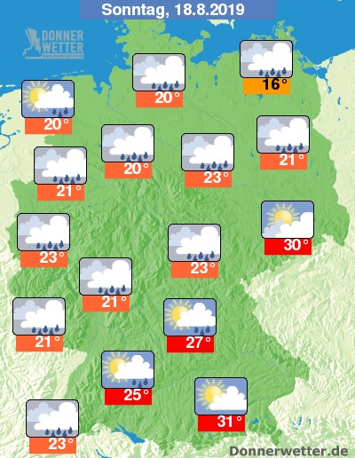 Am Sonntag ist es im Süden noch oft heiter bis sonnig und trocken, im Osten ist es teils aufgelockert, teils stark. Im Rest der Republik ist es meist stark bewölkt, dabei bilden sich bevorzugt über der Nordwesthälfte gebietsweise Schauer, sonst bilden sich nur selten einzelne Schauer oder Gewitter. Die Temperatur steigt auf teils nur 16 Grad an der Ostsee und bis zu 31 Grad in München.