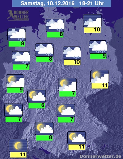 Heute Abend ist es über dem Norden bereits bedeckt und es fällt zeitweise Regen, der sich im Abendverlauf etwa bis über die Nordhälfte Deutschland hin ausbreitet. Im Süden ist der Himmel jedoch locker oder wechselnd bewölkt, hier bleibt es trocken. Die Temperatur liegt bei Werten zwischen 6 und 11 Grad.