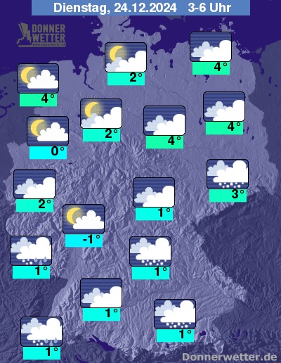 Am Heiligabend ist es über dem Land verbreitet stark, vor allem im Norden und Westen zumindest teilweise auch mal aufgelockert bewölkt. Im Süden und über Sachsen fällt anfangs noch etwas Schnee oder Schneeregen, sonst bleibt es jedoch meist trocken. Die Temperatur erreicht teils 0 Grad an den Alpen und bis etwa 6 Grad im Rheinland.