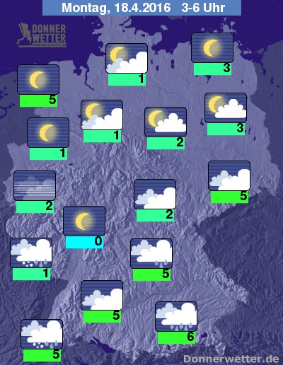 In der folgenden Nacht bleibt der Himmel über dem Süden weitgehend bedeckt und es fällt weiterhin zeitweise, am Alpenrand auch langanhaltender Regen. Vom Osten bis zur Landesmitte ist es mehrheitlich dicht bewölkt, jedoch trocken. Im Norden und Westen ist es überwiegend sternenklar, hier und da sind auch lockere Wolken möglich, dabei bleibt es trocken. Die Temperatur sinkt auf 6 Grad in München und bis 0 Grad am Westerwald.
