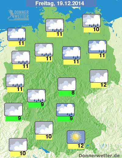 Heute ist es im Süden häufig freundlich und trocken mit teils sonnigen Abschnitten, sonst halten sich dagegen weitgehend dichte Wolken und es fällt zeitweise, teils auch kräftiger Regen. Dazu weht oft frischer bis starker Wind. Die Temperatur liegt bei 8 Grad im Thüringer Becken und bis 12 Grad in München.