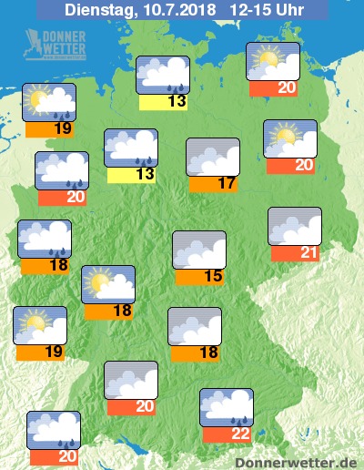 Heute Nachmittag ist es über dem Land meist stark und zum Teil aufgelockert bewölkt, dabei bilden sich im Süden und Nordwesten gebietsweise Schauer und mögliche Gewitter, auch im Norden sind einzelne Schauer möglich, sonst bleibt es weitgehend trocken. Die Temperatur liegt bei teils nur 13 Grad in Schleswig-Holstein und bis 22 Grad in München.