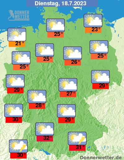 Am Dienstag ist es zumeist heiter bis sonnig. Im Süden und im Norden ziehen gebietsweise auch einige Quellwolken auf, dabei sind vereinzelte Schauer und Gewitter möglich. Im übrigen Land bleibt es trocken bei Höchstwerten von 21 Grad in Cuxhaven und bis 32 Grad in Stuttgart.