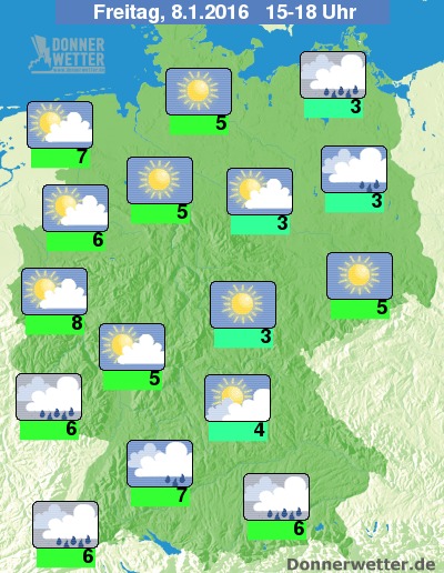 Heute Nachmittag kann es im Nordosten unter oft dichten Wolken noch zeitweise regnen. Im Süden ziehen von Süden her ebenfalls dichte Wolken auf und es fällt zeitweise Regen. Im übrigen Bundesgbiet ist es dagegen meist heiter bis sonnig, teils ziehen aber auch einige Wolken durch, dazu bleibt es trocken. Die Temperatur liegt bei 3 Grad in Magdeburg und bis 8 Grad in Bonn. Im Norden weht verbreitet starker bis stürmischer Wind, dabei sind auch Sturmböen möglich. An der See und auf den Bergen herrscht oft Sturm.