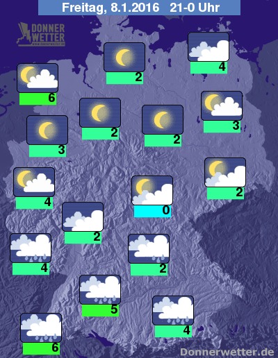 Heute Abend klingt auch der Regen im Nordosten weitgehend ab, hier bleibt es aber noch meist stark bewölkt. Im Süden fällt unter dichten Wolken zum Teil langanhaltender, an den Alpen auch ergiebiger Regen, stellenweise ist auch Schneeregen möglich. Über der Nordhälfte zeigt sich der Himmel hingegen verbreitet sternenklar oder nur locker bewölkt, dabei bleibt es trocken. Die Abendtemperatur liegt bei 6 Grad in Freiburg und um 0 Grad im Grabfeld. Im Nordosten weht anfangs ein teils starker, an der Ostsee auch ein stürmischer Wind.