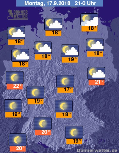 Am späten Abend und in der Nacht bleibt der Himmel über der Nord- und anfangs auch über der Osthälfte locker bewölkt. Im Osten klart es im Nachtverlauf teilweise auf. Im restlichen Bundesgebiet bleibt der Himmel zumeist wolkenfrei.