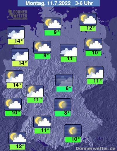 In der bevorstehenden Nacht zeigt sich der Himmel über der Südhälfte locker bewölkt, oft auch sternenklar. Weiter nach Norden hin ist es auch teils locker, gebietsweise aber auch stark bewölkt, dazu bleibt es weitgehend trocken. Die Temperatur sinkt auf 14 Grad an der Ems und 6 Grad im Eichsfeld.