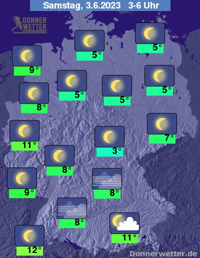 In der Nacht zum Samstag zeigt sich der Himmel verbreitet sternenklar. Nur regional sind auch mal ein paar lockere Wolken möglich. Bei Tiefstwerten von 12 Grad in Freiburg und bis 3 Grad in Jena bleibt es landesweit trocken.