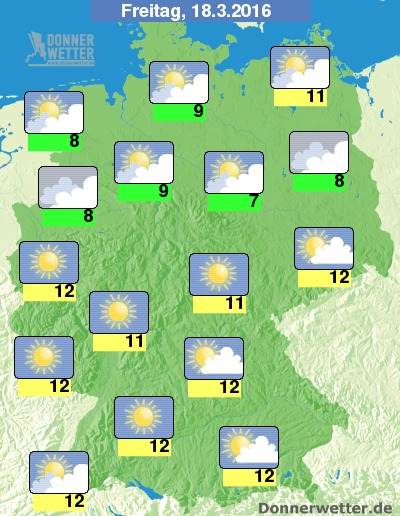 Heute bleibt es über der Südhälfte Deutschlands verbreitet sonnig und es ziehen nur selten einige Wolken durch, dazu bleibt es auch trocken, weiter nach Norden hin ist es dagegen oft stark, gebietsweise auch aufgelockert bewölkt, dabei bleibt es jedoch weitgehend trocken. Die Temperatur steigt auf 7 Grad in Dessau und bis 12 Grad im Oberrheingraben.