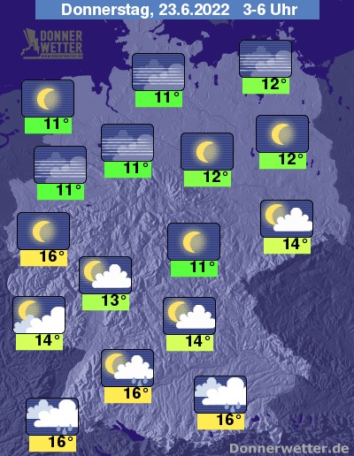 In der folgenden Nacht bilden sich im Süden bei teils aufgelockerter, teils starker Bewölkung einzelne Schauer. Etwa nördlich der Mainlinie ist der Himmel sternenklar, dazu bleibt es trocken. Die Temperatur sinkt auf 16 Grad in München und 11 Grad in Hamburg.