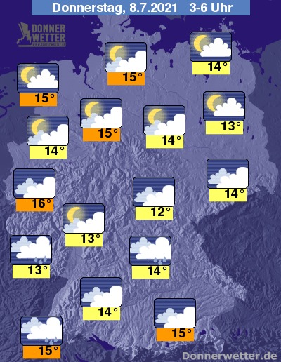 In der folgenden Nacht ist der Himmel über dem Süden weitgehend bedeckt und es können sich hier einzelne Schauer bilden. Im übrigen Land ist es verbreitet locker bis aufgelockert, teils auch stark bewölkt. Vor allem im Norden zeigt sich der Himmel auch sternenklar. Es bleibt trocken und die Werte sinken auf 16 Grad in Köln und bis 12 Grad in Jena.