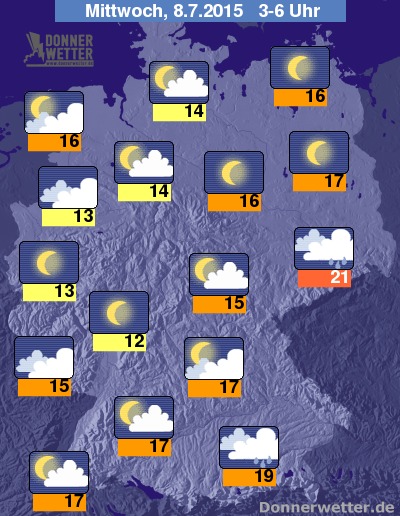 In der folgenden Nacht verlagern sich die Schauer und weiterhin teils schweren Gewitter immer weiter in den Osten und Süden Deutschlands, gegen Morgen sind nur noch im Südosten und im äußeren Süden zeitweise Schauer und einzelne Gewitter möglich. In den übrigen Landesteilen zeigt sich der Himmel im Nachtverlauf zunehmend locker bewölkt und häufig auch sternenklar, dazu bleibt es dann trocken. Die Temperatur sinkt auf tropische 21 Grad in Dresden und bis 12 Grad in der Wetterau.