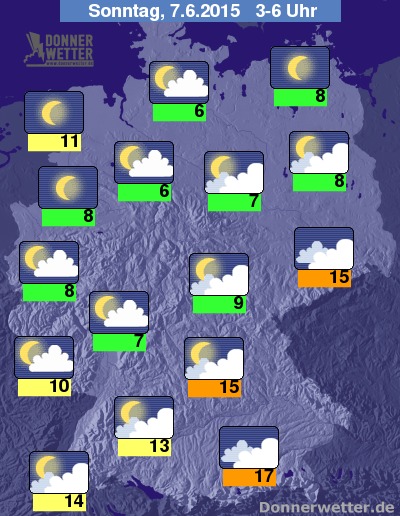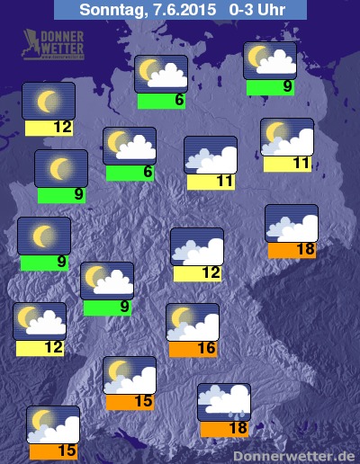 In der zweiten Nachthälfte klingen die Schauer im Südosten immer weiter ab. Bei wechselnder bis dichter Bewölkung werden Tiefstwerte um 17 bis 15 Grad C, in den Mittelgebirgen um 9 Grad C erreicht.