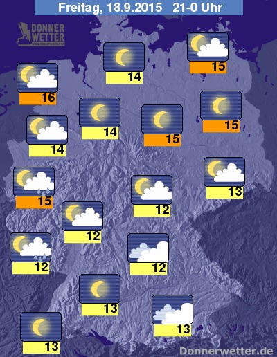 Heute Abend bleibt es im Südosten Deutschlands zumeist bedeckt, Regen fällt dabei aber nur selten. Im Westen der Republik ziehen gebiestweise dichte Wolken mit mögichen Schauen durch, häufig bleibt es hier aber auch trocken. Im großen Rest des Landes ist der Himmel nur locker bewölkt oder sogar sternenklar und es bleibt trocken. Die Abendtemperatur liegt bei 16 Grad an der Nordseeküste und etwa 12 Grad im Vogtland.