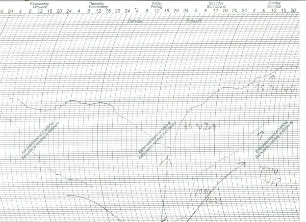 Die untere Kurve, deren Tiefpunkt am stürmischen Freitag nicht mal mehr auf den Bildausschnitt passte, zeigt der Verlauf in der letzten Woche. Die "Schönwetter-Kurve" darüber bildet den Verlauf in der von mildem Hochdruckwetter geprägten vorletzten Woche ab.