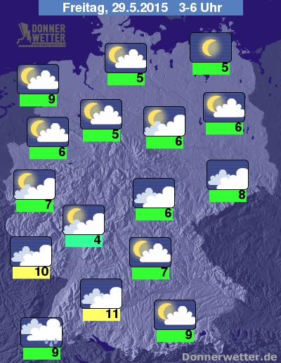 In der Nacht zum Freitag sind am Schwarzwald unter teils dichten Wolken einzelne Schauer möglich, sonst zieht überwiegend wechselnde, zum Teil auch starke Bewölkung durch und es bleibt trocken. Besonders im Norden zeigt sich auch ein oft sternenklarer Nachthimmel. Die Temperatur sinkt auf 11 Grad in Karlsruhe und auf etwa 4 Grad am Taunus.