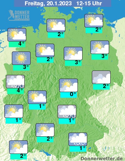 Heute Nachmittag fällt über Bayern, dem Saarland, Rheinland-Pfalz und dem südlichen NRW gebietsweise Schnee oder Schneeregen. Im übrigen Land zeigt sich zwischen den Wolken auch häufig die Sonne und es bleibt weitgehend trocken. Die Temperatur liegt bei 0 Grad im Vogtland und 4 Grad im Rheinland.