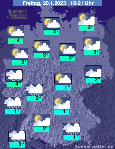 Heute Abend fällt bei dichten Wolken im Westen, Südwesten und Süden des Landes gebietsweise Schnee oder Schneeregen. Im Osten ist es meist stark bewölkt, aber trocken, sonst ist es überwiegend locker bewölkt und teils sternenklar, dazu bleibt es ebenfalls trocken. Die Temperatur liegt bei 1 Grad im Eichsfeld und bis 4 Grad an der Nordsee.