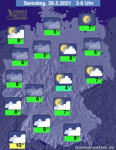 In der kommenden Nacht bleibt es über dem Süden Deutschlands oft stark, teils ist es hier aufgelockert bewölkt. Im übrigen Bundesgebiet zeigt sich der Himmel verbreitet sternenklar oder nur locker bewölkt. Es bleibt überall trocken bei Tiefstwerten von 10 Grad im Breisgau und bis 4 Grad im Thüringer Becken.