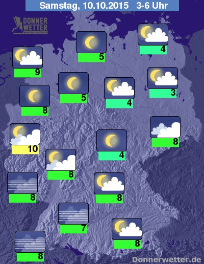 In der folgenden Nacht halten sich vor allem im Osten und auch im Westen der Republik oft dichte Wolken. Im übrigen Land zeigt sich der Himmel hingegen verbreitet sternenklar oder nur locker bewölkt. Es bleibt bundesweit trocken, stellenweise bildet sich jedoch Nebel oder Hochnebel. Die Temperatur sinkt auf 10 Grad in der Kölner Bucht und bis 3 Grad im nördlichen Brandenburg.