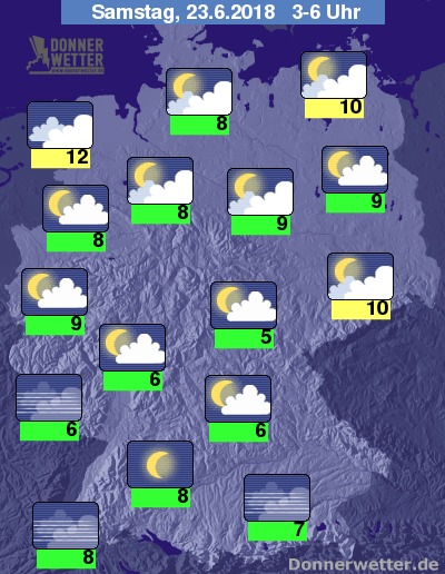 In der Nacht zum Samstag klingen letzte Schauer über der Osthälfte rasch ab und der Himmel lockert verbreitet auf. Weiter nach Westen hin ist es bereits überwiegend nur locker bewölkt oder sternenklar. Im Nordseeumfeld halten sich jedoch oft dichte Wolken, dazu bleibt es trocken. Die Temperatur sinkt auf 12 Grad an der Nordsee und bis 5 Grad im Grabfeld.