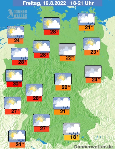 Heute Abend ist es über der Republik aufgelockert oder stark bewölkt. Besonders über Bayern bilden sich wiederholt Schauer, selten auch noch Gewitter, sonst sind nur noch lokal Schauer möglich. Die Temperatur liegt bei 18 Grad in Augsburg und 30 Grad in Bonn.
