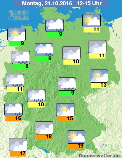 Die Temperaturen erreichen Werte um kühle 9 Grad C im Nordwesten und um 19 Grad C am Alpenrand.
