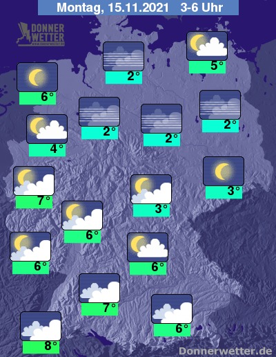 In der Nacht zum Montag hält sich im Süden noch oft dichte Bewölkung oder es ist hier neblig-trüb. Vor allem über der Nordhälfte des Landes ist es verbreitet gering bewölkt oder sternenklar, jedoch kann sich stellenweise Nebel oder Hochnebel bilden. Es bleibt überall trocken bei Tiefstwerten von 8 Grad in Freiburg und etwa 2 Grad in Hamburg.