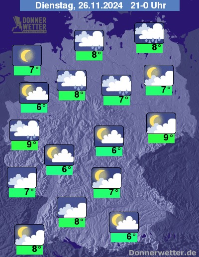 In der Nacht zum Mittwoch zieht Regen von Nordwesten ostwärts, dabei schwächen sich die Niederschläge ab. In den übrigen Landesteilen ist es teils wolkig, teils stark bewölkt und es bleibt meist trocken.
